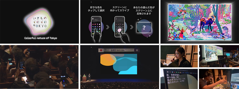 来場者はQRコードから自身のスマホをシステムと同期。画面上で選んだ色をスワイプすると、ステージ上の大型スクリーンに即座に反映され、全員で“東京の自然”を描くインタラクティブなビジュアル演出が展開されました。